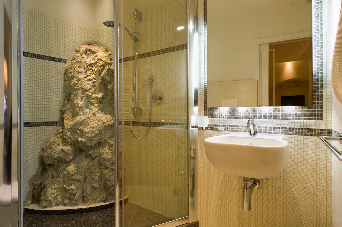 En suite luxury bathroom with large walk in showers and marble and Mosaic tiling