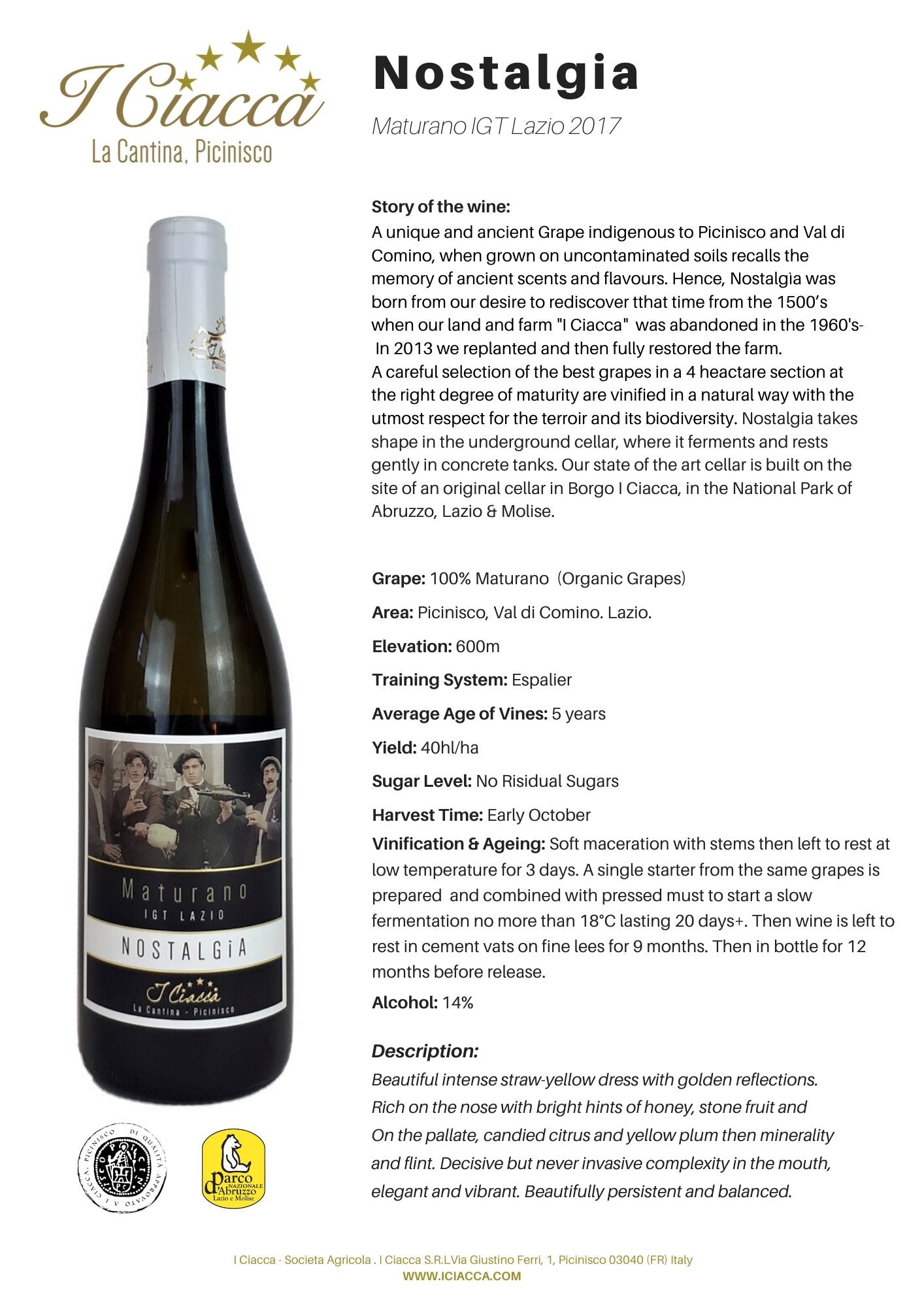 I Ciacca Nostalgia Maturano IGT wine, highlighting its organic nature, production method, and quality indicators such as alcohol content and sugar level.